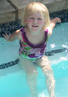 Zanna's in her second set of swim lessons this summer. She's taking lessons at Wells Branch Community Pool and we have really enjoyed both sessions. The first session we were in a "parent-toddler" class with Ms. Katie (whom Zanna now adores) and mostly did the basics: blow bubbles, kick, jump off the side, etc. Zanna was a fish from day one, which surprised me considering last year she wanted absolutely nothing to do with the water. That was way back in June, and now we're getting around to our second session of swim lessons, only this time, Zanna's in the Pre-school beginner class. When I arrived the first day donning my bathing suit, the other parents looked at me quizzically. I quickly learned that in the pre-school classes, it's "kids only" and mom 'gets' to sit out and watch.... aka roast in the heat!! I got smart after the first day, and bought pool tags for the family, so that I can swim with her before and after the lessons, which makes the heat less unbearable for those 35 minutes where she's being adorable in the pool and I'm baking on the sidelines. Today completed our first week and she did great! She even began to swim totally on her own today (for about 1 second) and will continue to work on that next week. Love my little fish :)